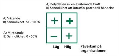 De omvärldskrafter som bedöms ha en nämnvärd betydelse för organisationen för man in på översta raden i modellen (i figuren finns bara ett litet urval krafter).