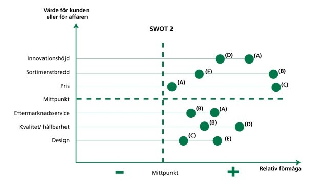 För till exempel sortimentsbredd är företaget B överlägset företaget E, som dock är duktigare än alla andra. Konkurrensnackdelarna ligger i matrisens övre vänstra kvadrant.