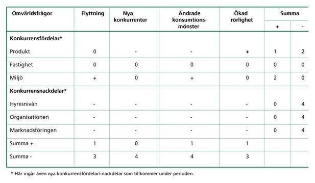 Granskar man omvärldens påverkan på de olika enskilda för- och nackdelarna ser man i kolumnen till höger, att konkurrensfördelarna inte berörs särskilt mycket. Miljöns ställning som en positiv faktor för företaget förstärks dock i framtiden (två plus). Läget är annorlunda för nackdelarna, bland annat bedöms företagets organisation och marknadsföringsfunktion vara svagheter. Utvecklingen under de närmaste åren förvärrar nu situationen och gör konkurrensnackdelarna betydligt mera utpräglade.