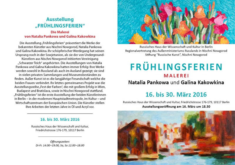 Natalia Pankova is a painter, who has twice been honoured of Nizhny Novgorod Award and the New Intelligentsia Award of the Moscow News Publishers and the Culture Award winner of “Person of the Year 2013” held by Delovoy Kvartal Publishing House.