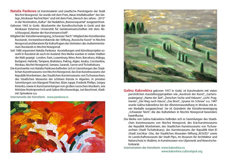 Natalia Pankova is a painter, who has twice been honoured of Nizhny Novgorod Award and the New Intelligentsia Award of the Moscow News Publishers and the Culture Award winner of “Person of the Year 2013” held by Delovoy Kvartal Publishing House.