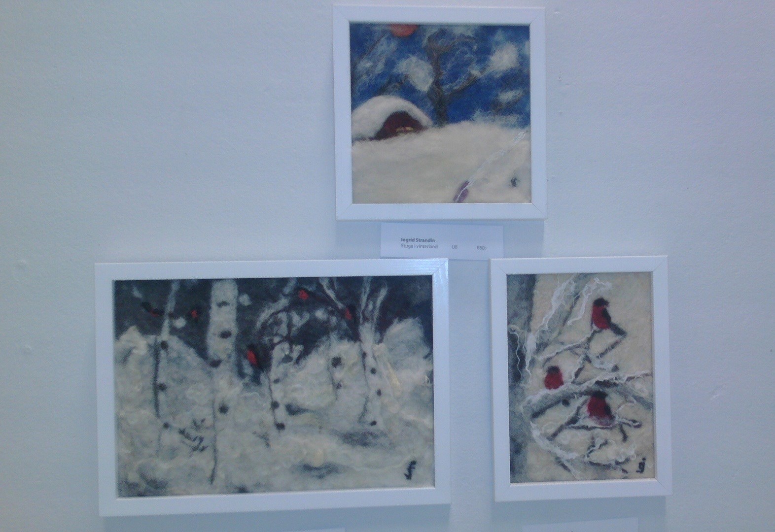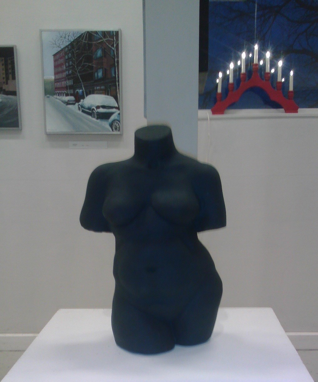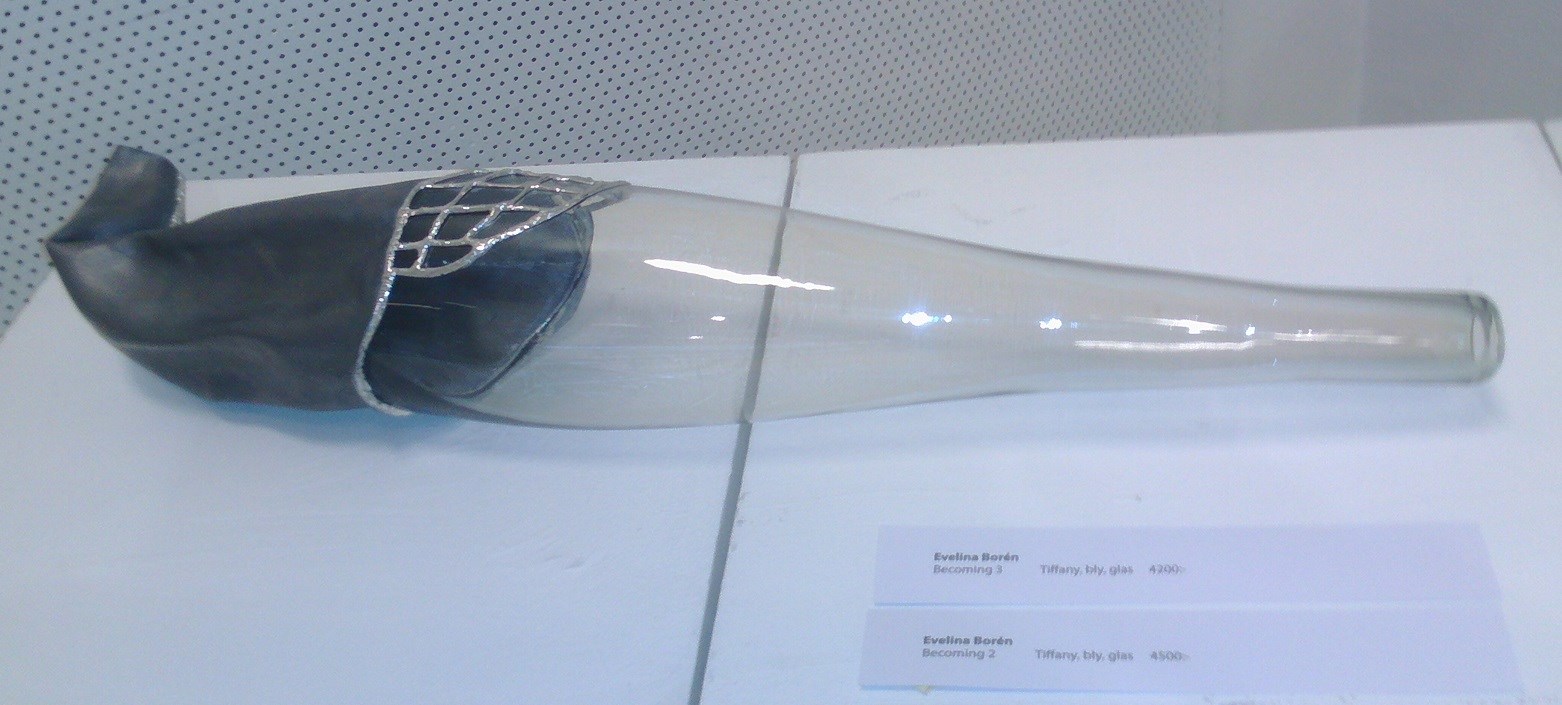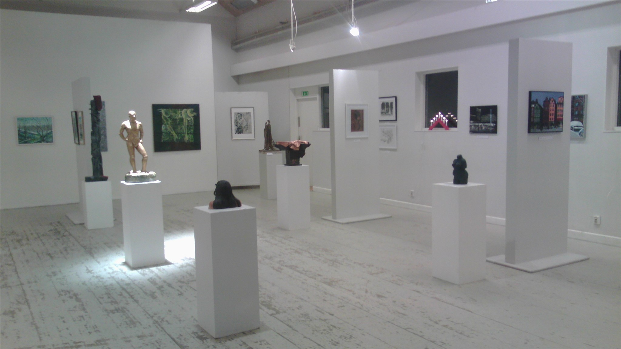 Francina Dalmulder Larssons ”blå tavlor”; ”Becoming 2” och ”Becoming 3” (Tiffany, glas, bly) - underbara konstverk av Evelina Borén; Reiko Takenakas mystiska ”Lyckoönskande kruka” och ”Guldmanen” i salens mitt, som drog till sig allas blickar; Ingrid Strandins ”Stuga i vinterland” och flera andras talangfulla konstnärers verk…