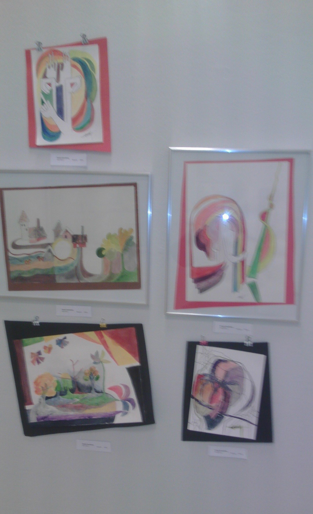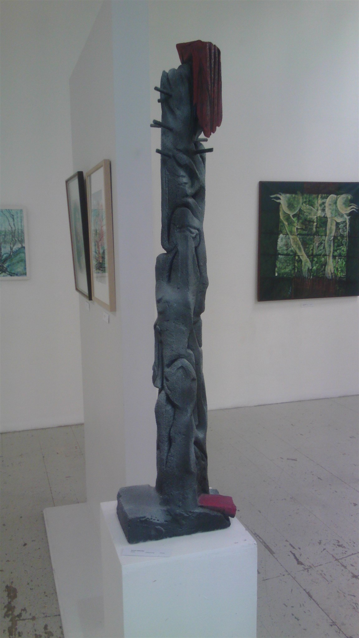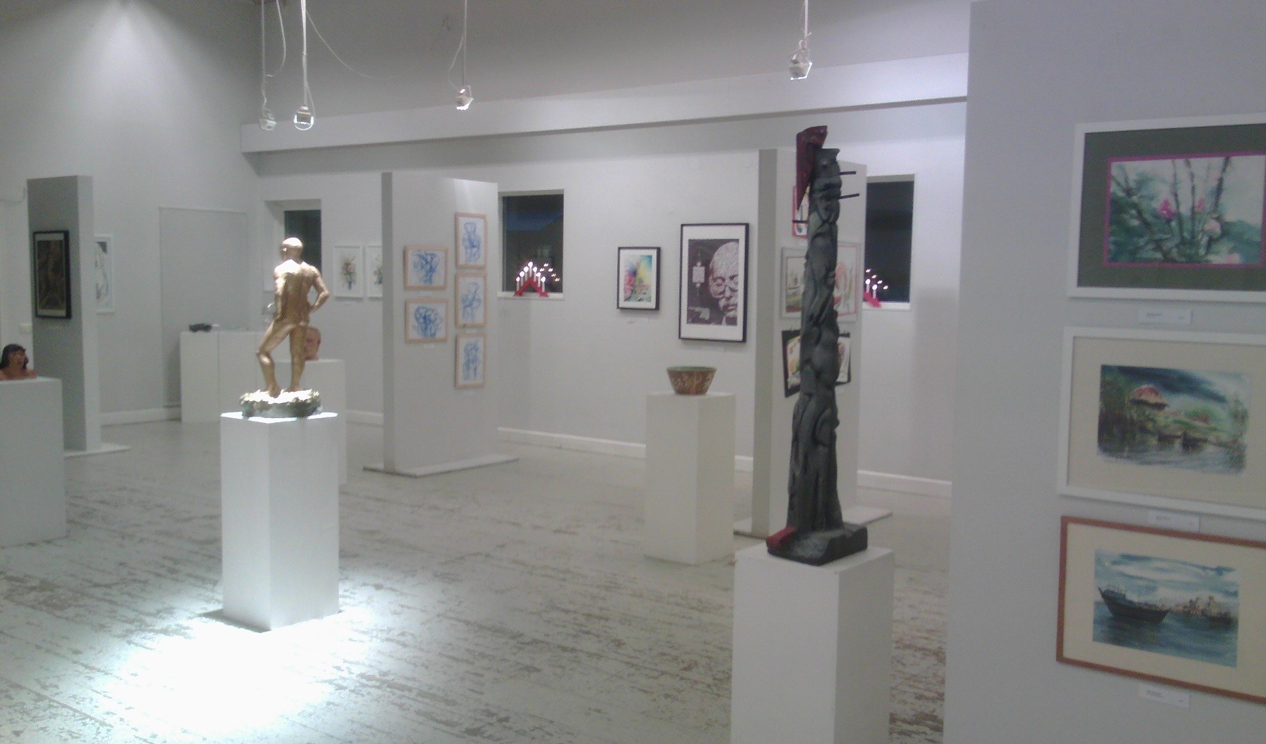 Francina Dalmulder Larssons ”blå tavlor”; ”Becoming 2” och ”Becoming 3” (Tiffany, glas, bly) - underbara konstverk av Evelina Borén; Reiko Takenakas mystiska ”Lyckoönskande kruka” och ”Guldmanen” i salens mitt, som drog till sig allas blickar; Ingrid Strandins ”Stuga i vinterland” och flera andras talangfulla konstnärers verk…